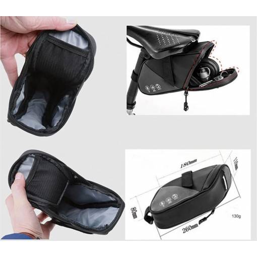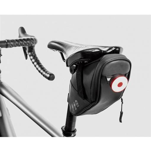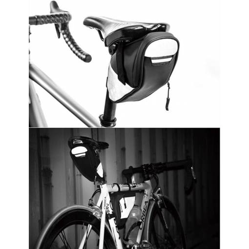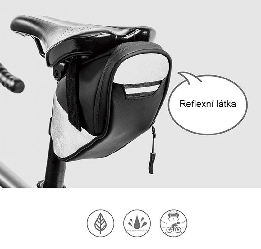 Reflexná a bezpečná jazda: reflexná páska na sedlovej taške zlepšuje viditeľnosť v tme a zaisťuje bezpečnú jazdu, otvory na zadnej strane tašky slúžia na pripevnenie zadného svetla pre ešte väčšiu viditeľnosť.