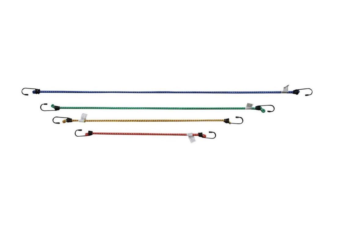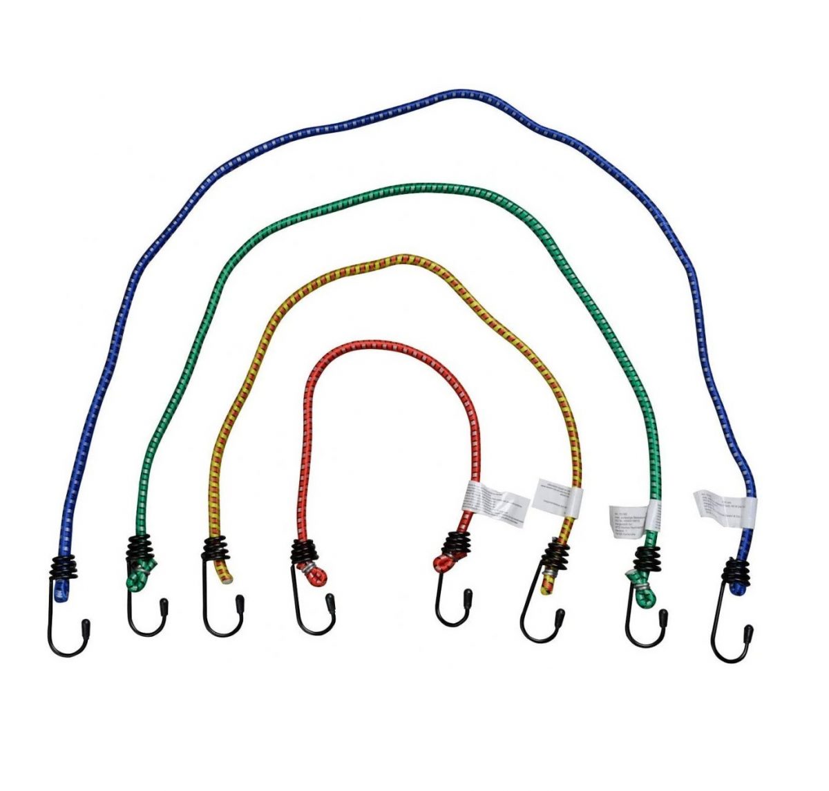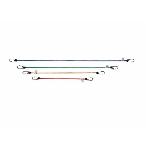 Upínacie gumy v štyroch rozmeroch, s robustnými háčikmi s PVC vrstvou, ktorá slúži ako ochrana pred poranením.