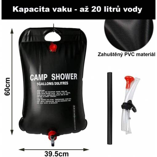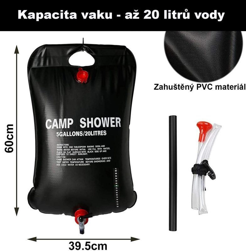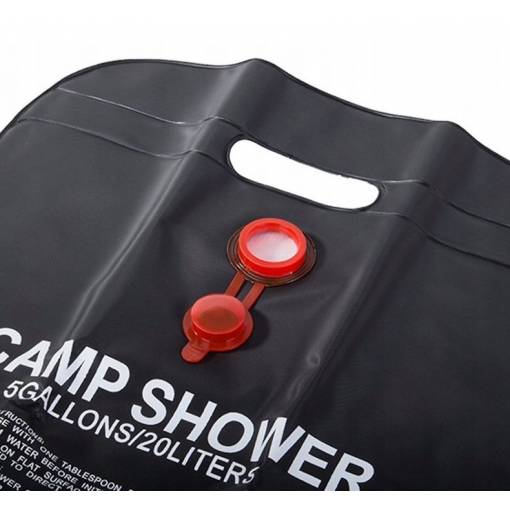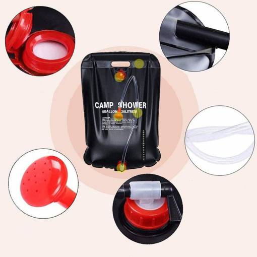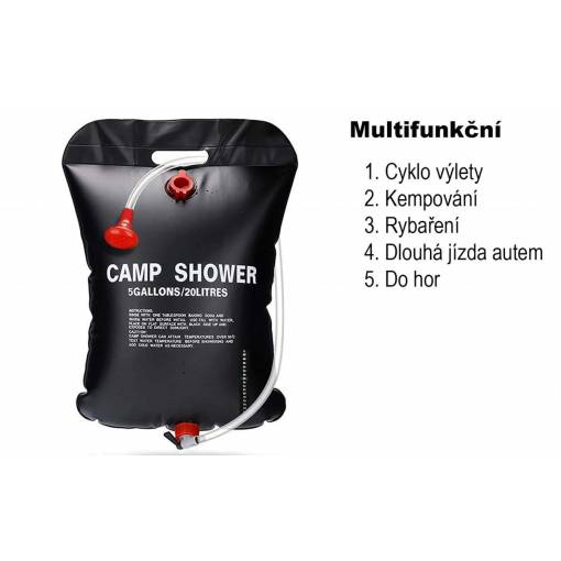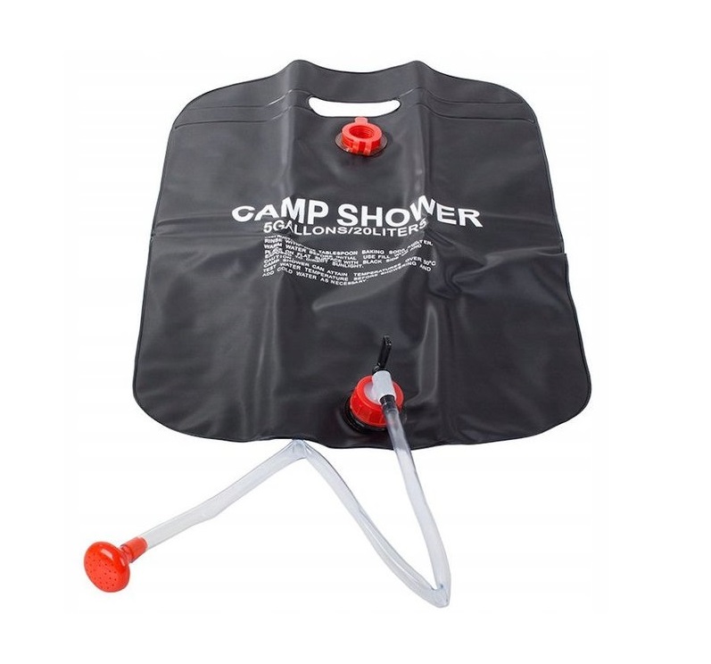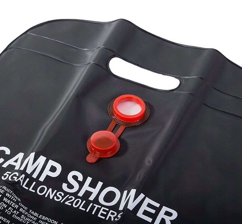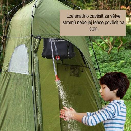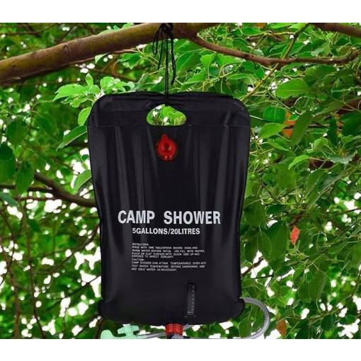 20 litrová solárna sprcha: Praktický sprchový vak pojme až 20 litrov vody. Môžete ho zavesiť do vetiev stromov alebo na stan a ľahko sa umyť.