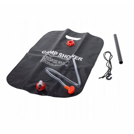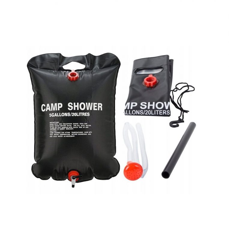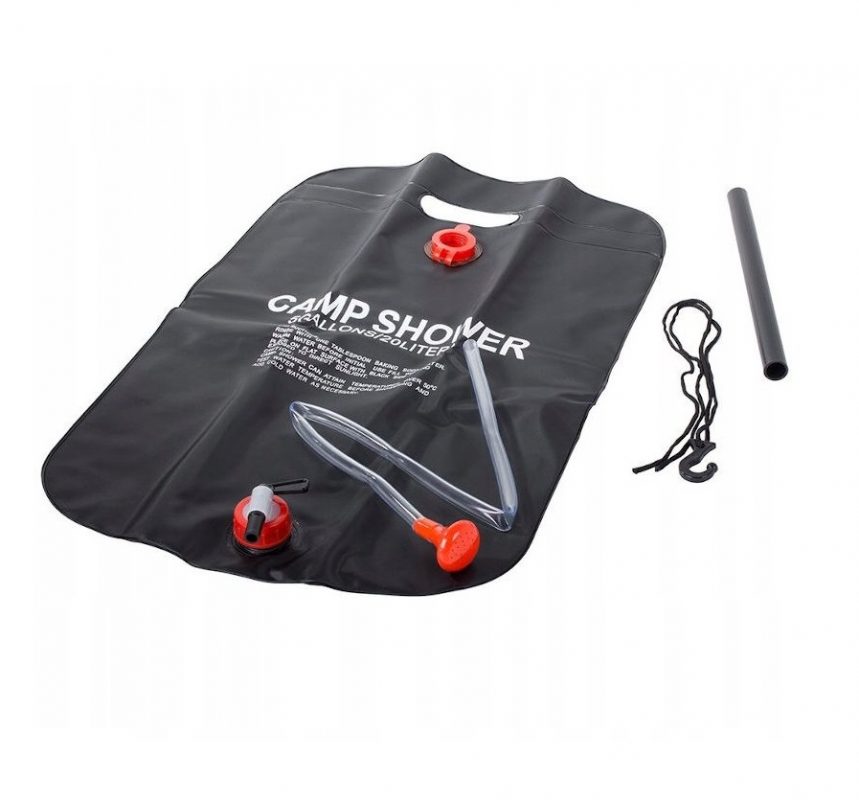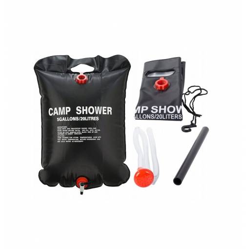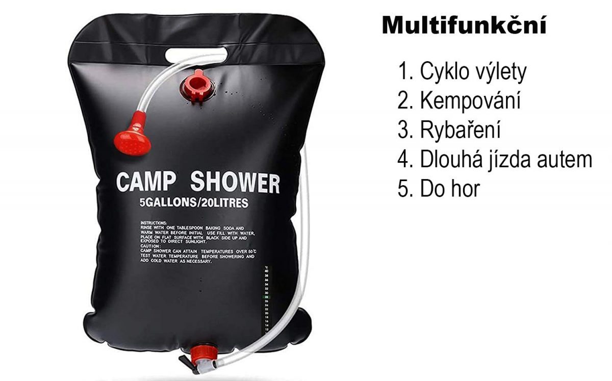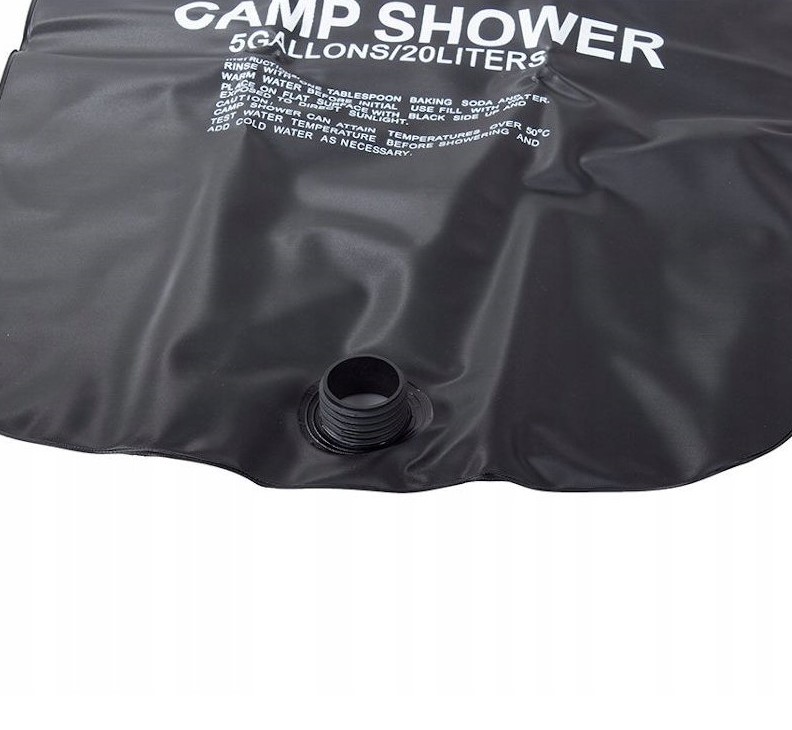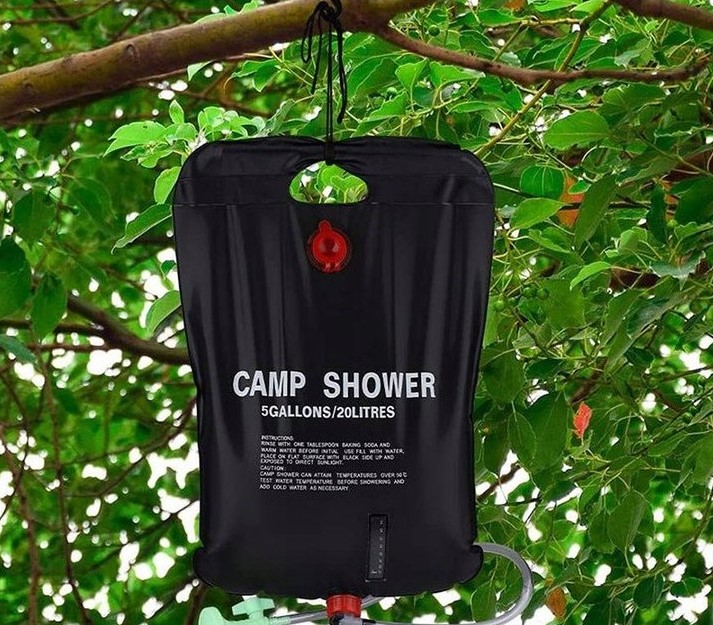 20 litrová solárna sprcha: Praktický sprchový vak pojme až 20 litrov vody. Môžete ho zavesiť do vetiev stromov alebo na stan a ľahko sa umyť.
