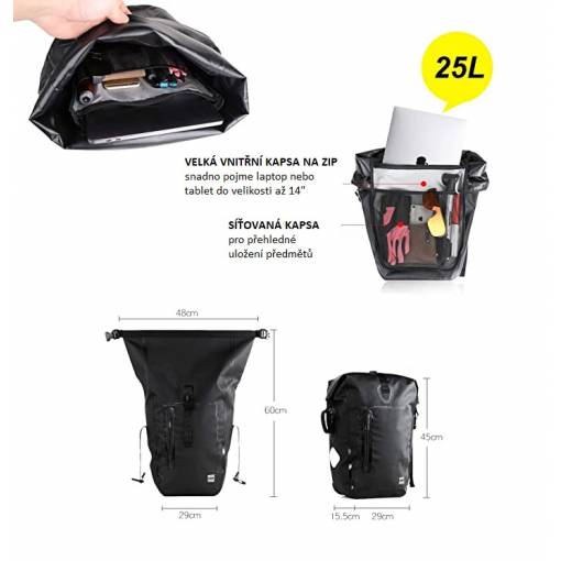 Kapacita 25 litrov poskytne dostatok priestoru na uloženie všetkých nevyhnutností, či už vyrážate na cyklo výlet, do práce alebo na menší nákup.