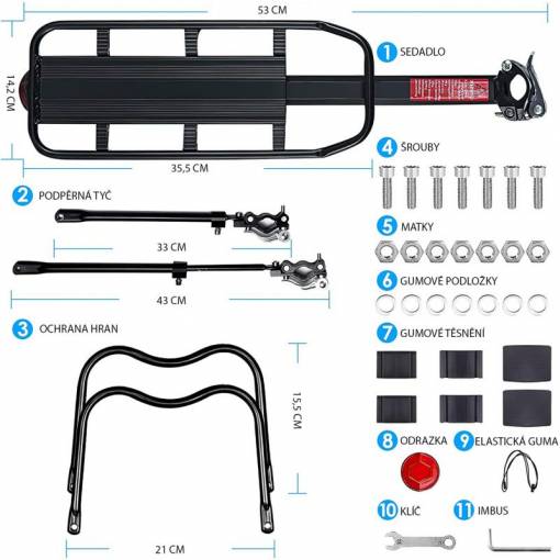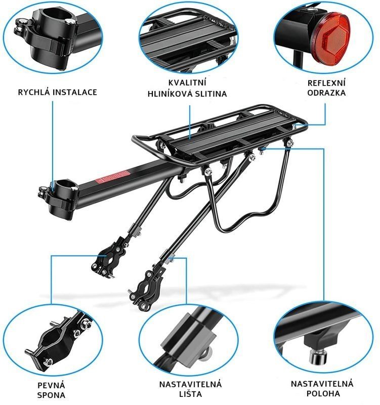 Nosič navyše disponuje bočnými ochrannými rámami, ktoré zamedzia poškriabaniu Vašej batožiny, a červenou zadnou odrazkou.