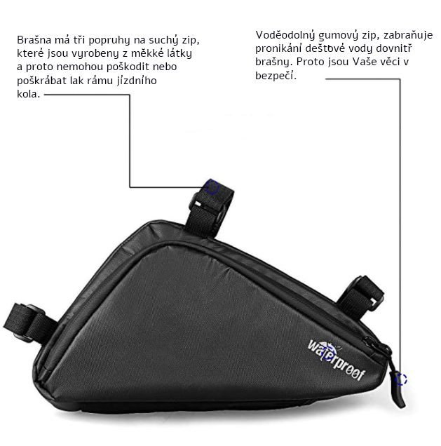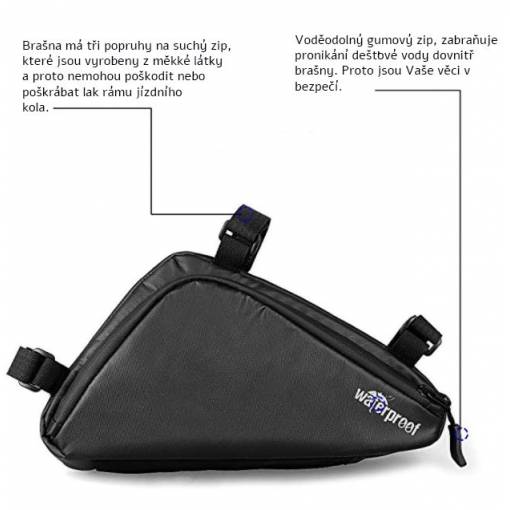 Taška má tri popruhy na suchý zips, ktorými ju možno ľahko a rýchlo upevniť k rámu kolesa.