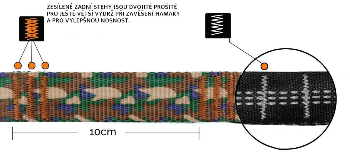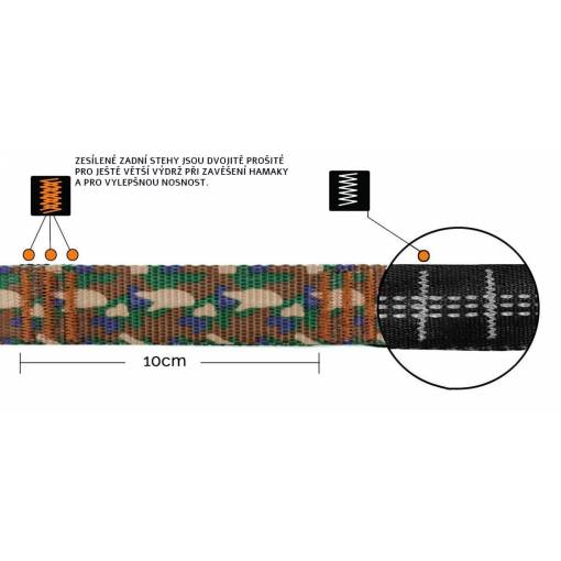 Upevňovacia sada na hamak obsahuje dve smyčkové lanka a karabíny s úložným sáčkom. Lano má niekoľko ok pre lepšie zavesenie hamaky.