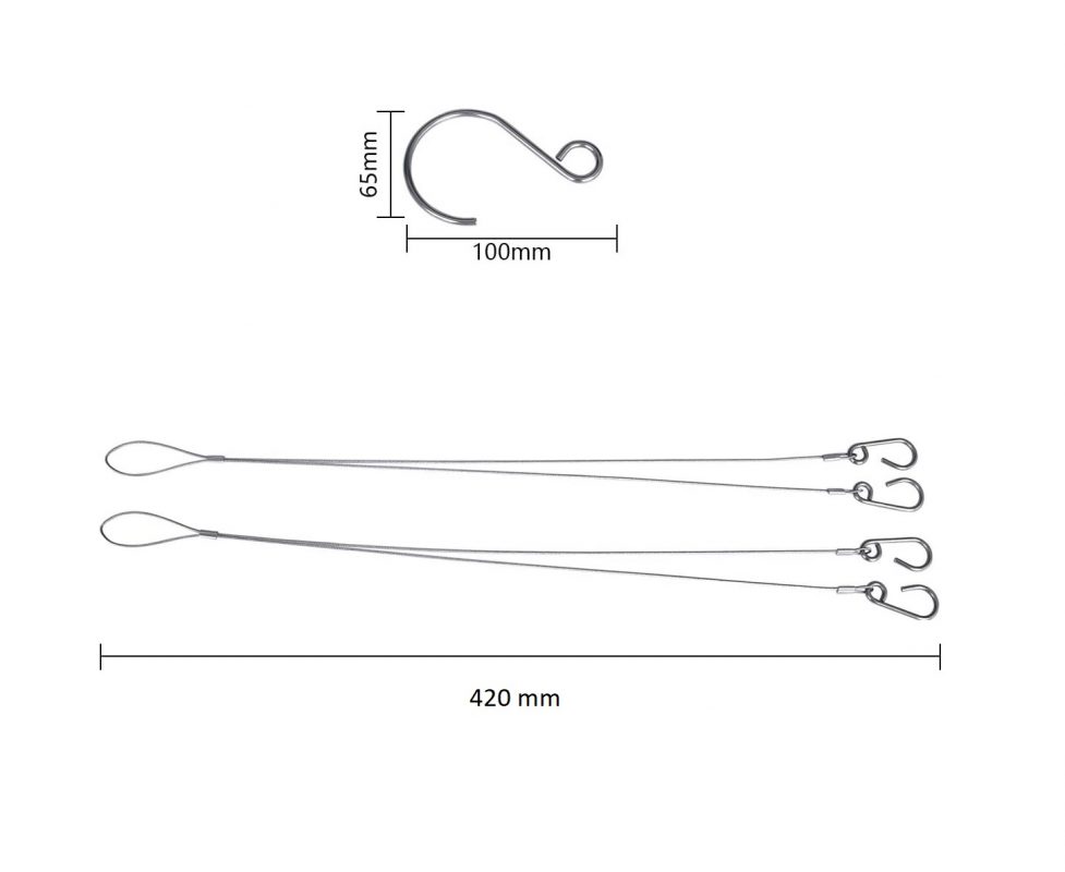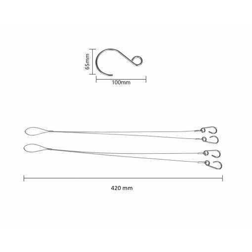 Súprava obsahuje dva kusy (každý kus = dve lanká so slučkou na jednom konci a dvoma háčikmi na druhom konci) a veľký háčik.