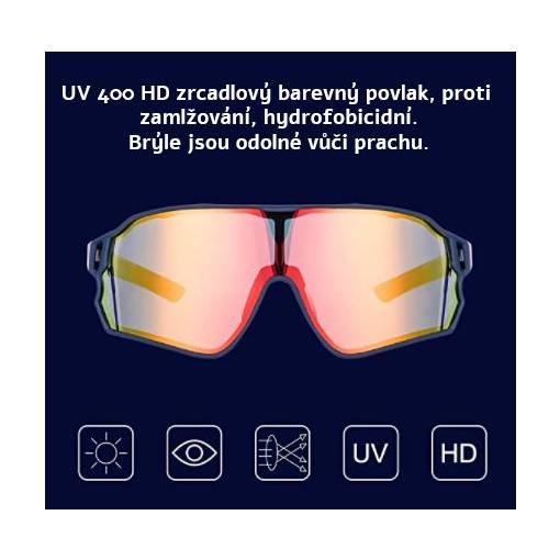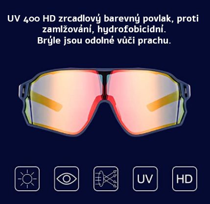 Ochrana UV400: Tieto slnečné okuliare sa pýšia 100% ochranou UV400 a farebným zrkadlovým povlakom, ktorý odpudzuje vodu a nečistoty. Široké šošovky poskytujú nielen väčšie zorné pole, ale taktiež chránia Vaše oči pred vetrom, prachom a hmyzom. Majú minimálny odpor vzduchu, preto sú vhodné na rýchlu jazdu ako za slnečného, tak oblačného počasia.