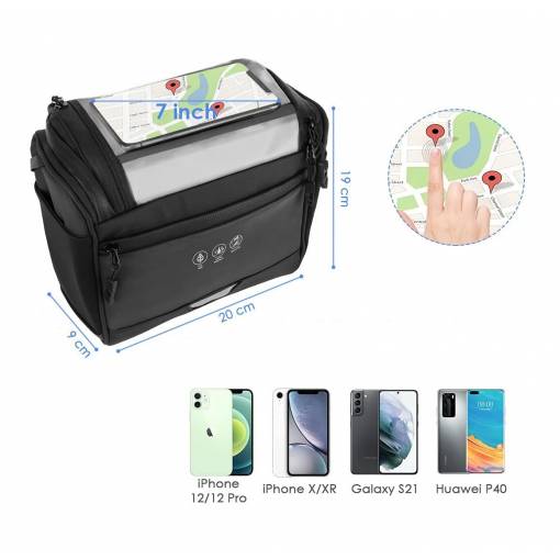 Balenie obsahuje jednu tašku na riadidlá bicykla s vreckom na mobilný telefón a odopínateľným popruhom.