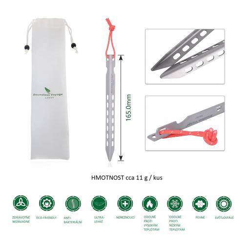 Ultraľahké titánové kolíky na upevnenie Vášho stanu alebo plachty ponúkajú aj napriek svojej nízkej hmotnosti vysokú stabilitu a odolnosť za každého počasia.