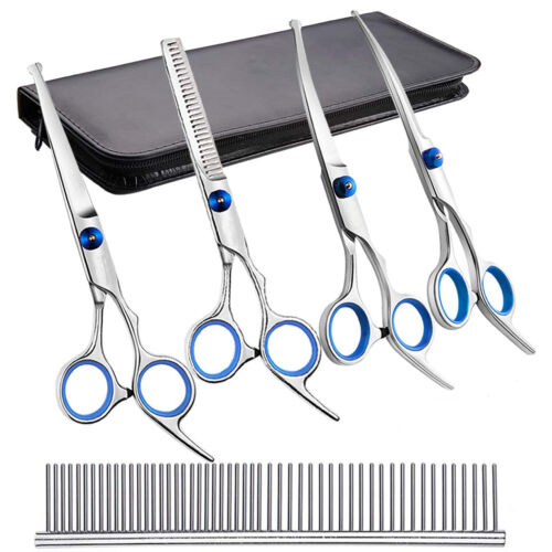 Sada nožníc na úpravu srsti psov s bezpečnostnými guľatými hrotmi z nerezovej ocele.