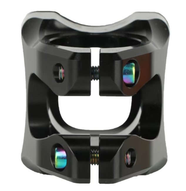 Upínanie na riadidlá s priemerom 31,8 mm a stĺpik vidlice 28,6 mm umožňuje kompatibilitu s väčšinou moderných kolies. Štýlový vzhľad podčiarkuje povrchová úprava skrutiek s titánovým efektom, ktorá nielen dobre vyzerá, ale zaisťuje aj pevné a bezpečné uchytenie.