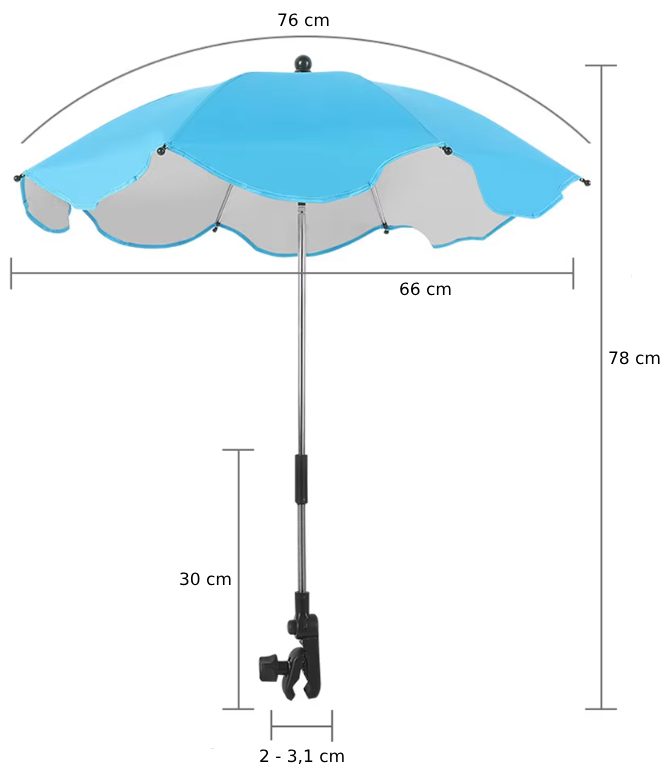 Dáždnik je navrhnutý s kompaktnými rozmermi, takže sa ľahko prenáša, a poskytuje dostatok tieňa. Je ideálny na použitie na pláži alebo pri upevnení na kočík.