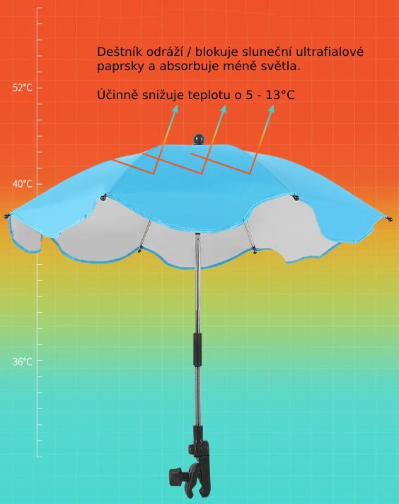 - 1x Nastaviteľný dáždnik s UV ochranou a upevnením na kočík