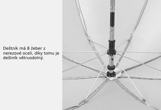 Dáždnik je vybavený konštrukciou z nerezovej ocele, ktorá je veľmi odolná voči korózii, čo zaisťuje dlhú životnosť aj pri častom používaní vo vonkajších podmienkach.