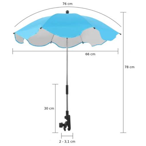 Dáždnik je navrhnutý s kompaktnými rozmermi, takže sa ľahko prenáša, a poskytuje dostatok tieňa. Je ideálny na použitie na pláži alebo pri upevnení na kočík.