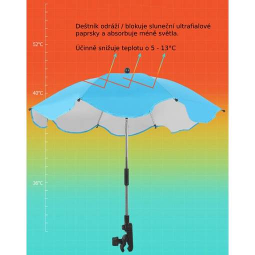 Dáždnik je navrhnutý s kompaktnými rozmermi, takže sa ľahko prenáša, a poskytuje dostatok tieňa. Je ideálny na použitie na pláži alebo pri upevnení na kočík.