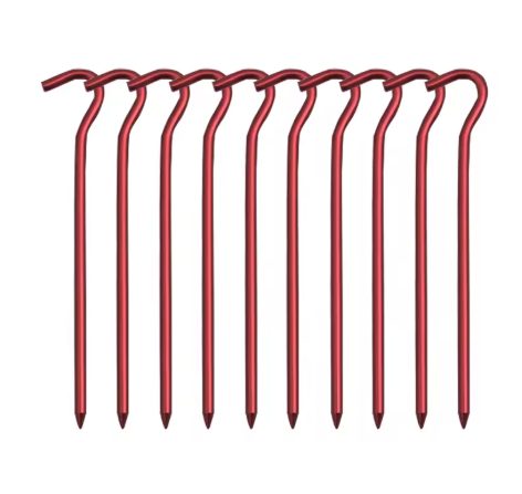 Praktická sada 10 ľahkých stanových kolíkov vyrobených z odolnej hliníkovej zliatiny s titanovým vzhľadom.