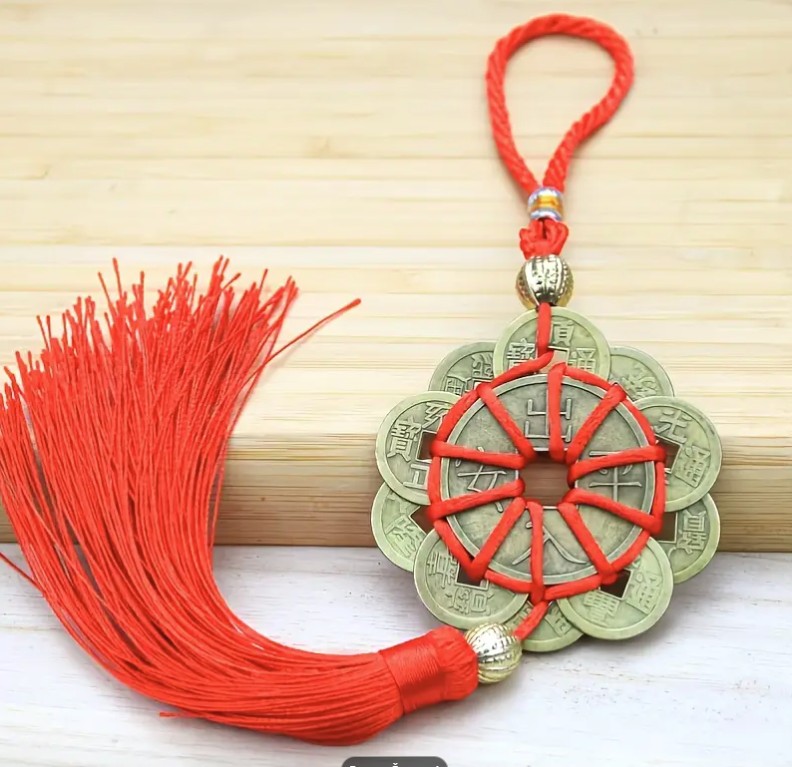 Červená šnúrka a stŕapec: Červená farba je v čínskej kultúre symbolom šťastia, vitality, sily a ochrany pred negatívnou energiou. Zviazanie mincí červenou šnúrkou aktivuje ich energiu – červená pôsobí ako „energetický spúšťač“. Stŕapec symbolizuje tok energie smerom nadol – teda prúd hojnosti, ktorý sa uvoľňuje do vášho života. Uzly a oplety znamenajú pevné spojenie, stabilitu a trvanie úspechu.
