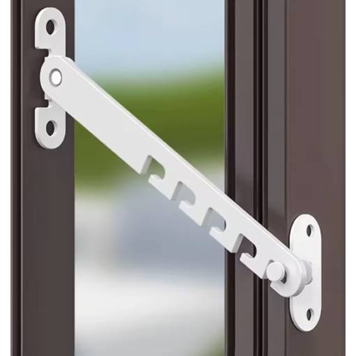 Praktická a bezpečná okenná zábrana z kovu s montážnymi šroubmi. Zaisťuje obmedzenie otvorenia okna alebo balkónových dverí a slúži ako poistka proti pádu, ale tiež ako dodatočný bezpečnostný prvok proti vlámaniu.