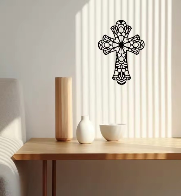 Vytvorte doma atmosféru pokoja, harmónie a elegancie vďaka tomuto štýlovému kovovému krížu s jemným ornamentálnym vzorom.u00a0Precízny laserový výrez vytvára pôsobivý a ľahký dizajn, ktorý na stene pôsobí téměř ako kresba – čisto, moderne a pritom s nádychom nežnosti.