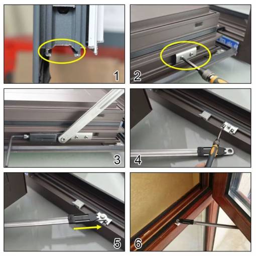 Priložte spodný držiak na rám okna (pevná časť), ideálne bližšie k pántom. Uistite sa, že nikde neprekáža kovanie.
