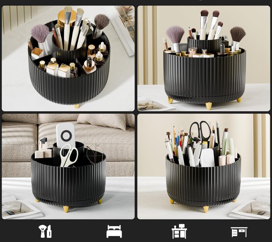 Štýlový a praktický organizér s otáčnou základňou vám pomôže udržať poriadok na toaletnom stolíku, v kúpeľni aj na pracovnom stole. Vďaka 360° rotácii máte všetko po ruke.</p>