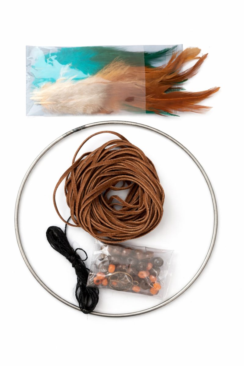 - Priloženou ceruzkou naberieme kamienok a nalepíme na príslušné miesto. Nakoniec vezeme sáčok s prevázky, na kterých už sú pripevnená pierka, a připevníme ich ku kruhu. Lapač snov je tak hotový, stačí ho len zavesiť!
